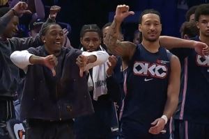 > 这氛围!卡鲁索快攻不扣篮 雷霆替补席集体弱爆了👎招呼!